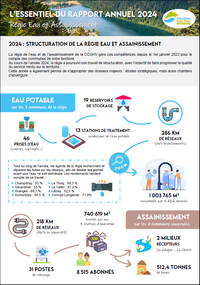 En parallèle de ce document, des rapports annuels sur le prix et la qualité du service (RPQS) sont également publiés dans le cadre de l’élimination des déchets ainsi que de l’eau et l’assainissement. Les indications présentes dans ces rapports sont d’ordre technique et financier (article L2224-5 du Code général des collectivités territoriales).